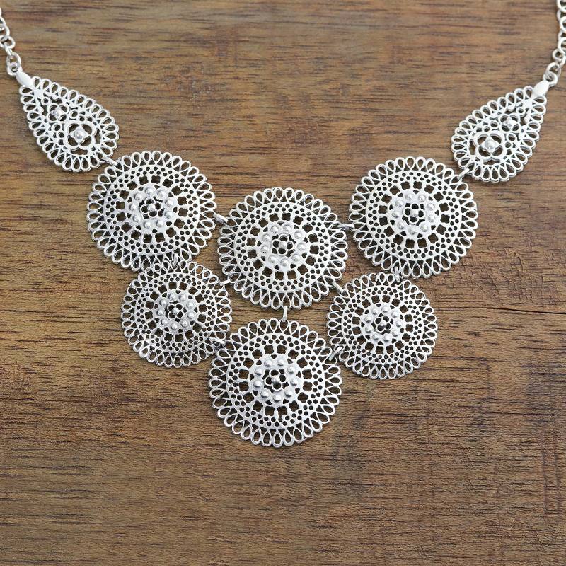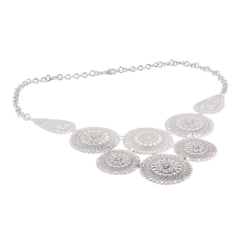 Crafted from sterling silver, a series of lacy medallions is linked together in the pendant of this statement necklace from India. Neetu Barathi designs this fascinating necklace, which features impressive openwork.