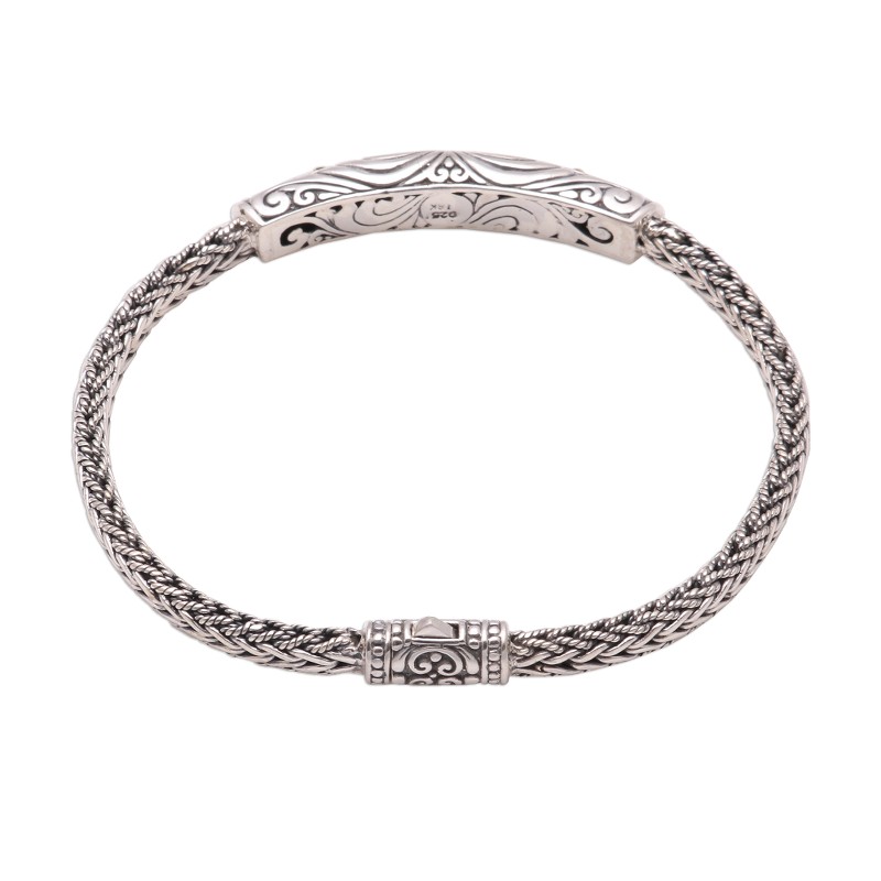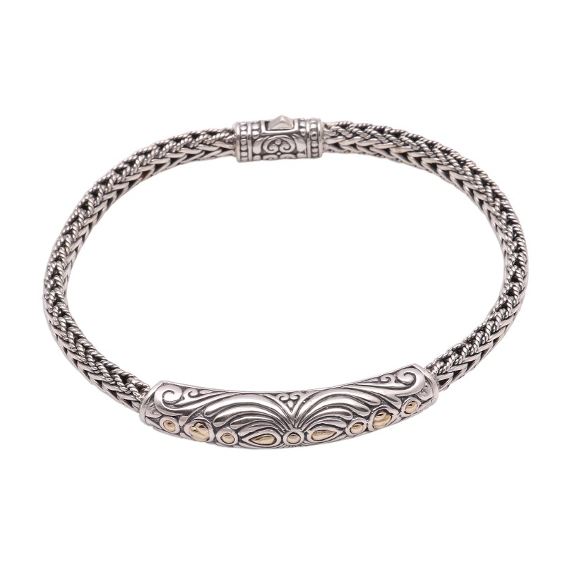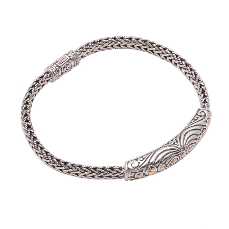 Lined with accents of 18k gold, the sterling silver pendant of this bracelet displays lovely swirl patterns that gleam with a combination of finishes that enhances their beauty. Balinese artisan Wayan Neri creates this bracelet, circling the wrist with sterling foxtail chain.