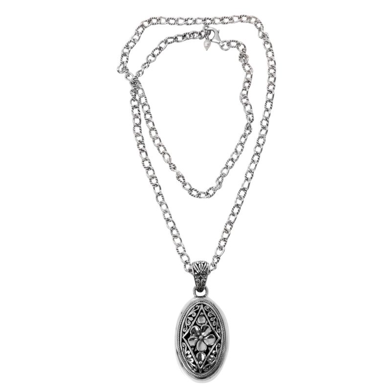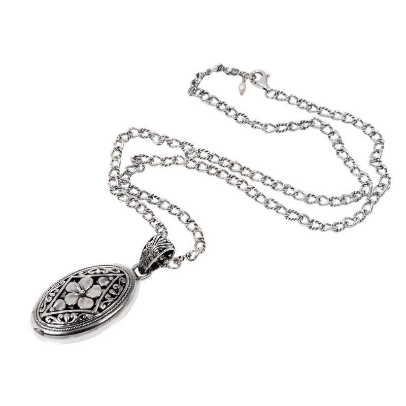 A blossoming hibiscus centers an oval medallion in this pretty pendant necklace from Bali's Kadek Hendra. The florid pendant is crafted by hand from sterling silver and centers a Cuban link chain with alternating smooth and rope-style links. A petite cultured freshwater pearl graces the lobster claw clasp.