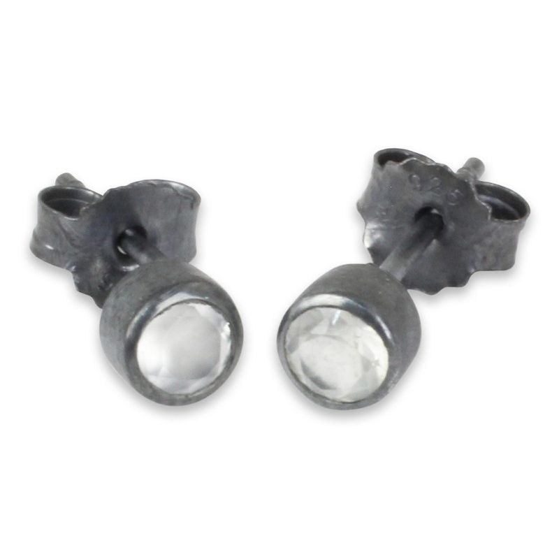 Crafted by hand, chic silver studs receive an oxidized satin finish. Jantana sets these classic earrings with faceted moonstone. The contrast is beautiful.