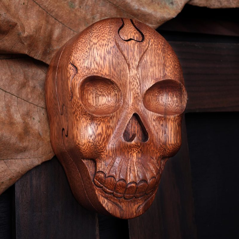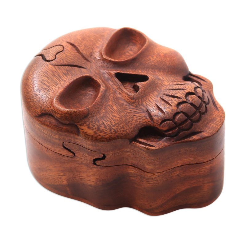 Hand-carved of rich suar wood, a cheery skull smiles from this puzzle box. Balinese artisan Wayan Rendah designs the box, featuring three separate pieces that must be removed before revealing its interior.