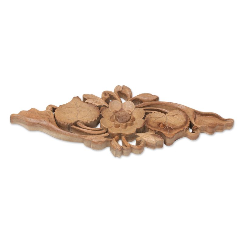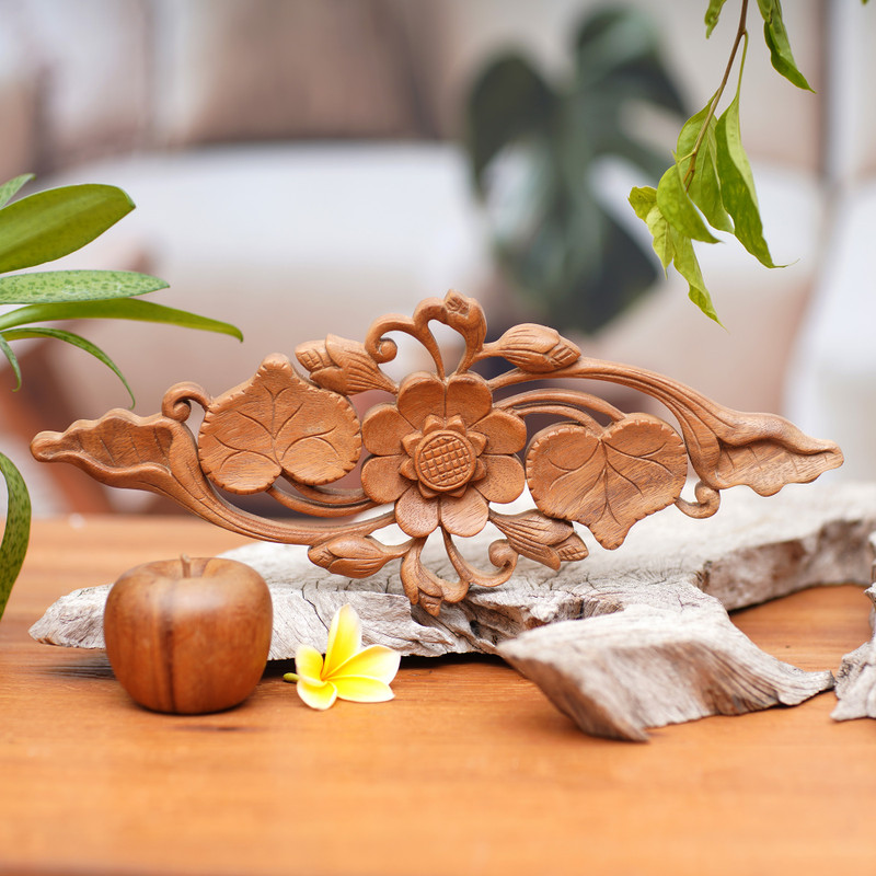 Hand-carved of Balinese suar wood by Made Mulyani, this lovely relief panel will add simple beauty to your decor. Leaves and vines swirl gracefully around a flower at the center of the wall panel.