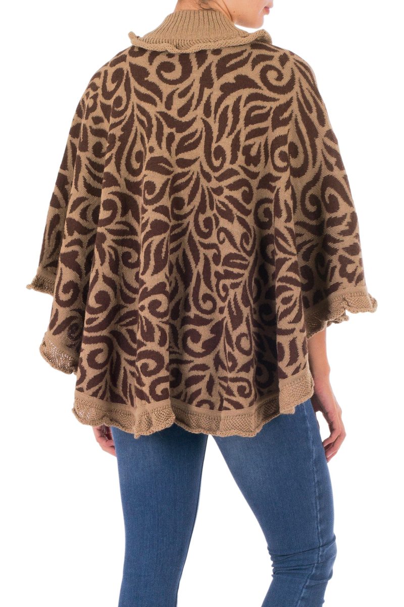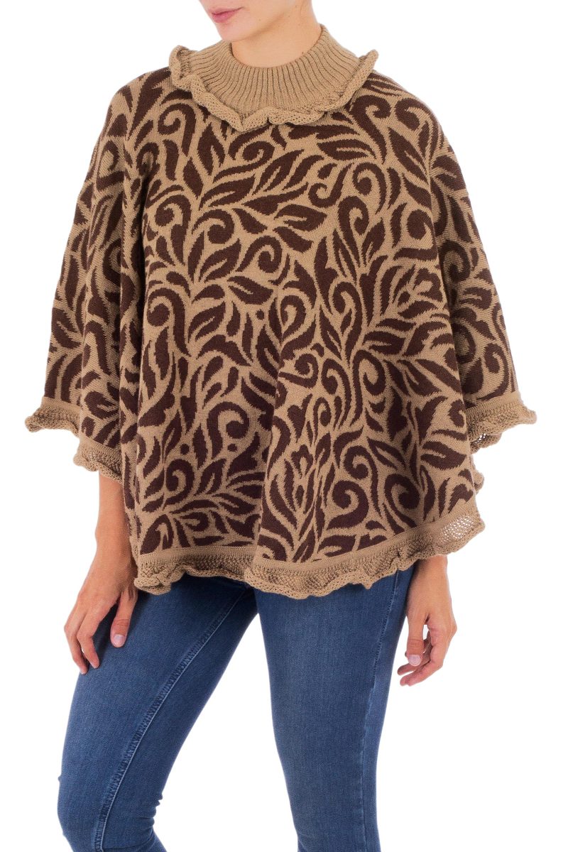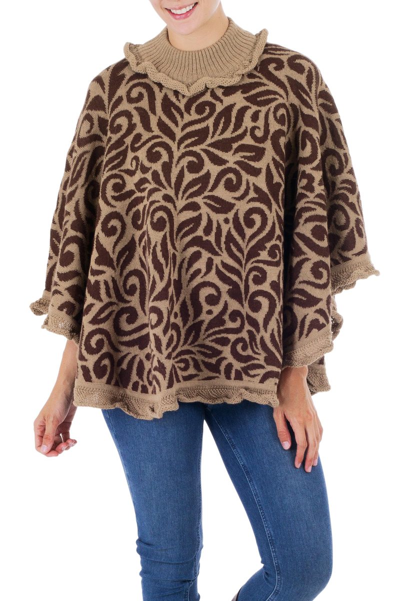 By Waldo Berrios, this beautiful poncho is colorful and feminine. Beige and brown foliage is crowned by a snug turtleneck. Both the collar and the hem feature a flirty crocheted lace in beige. The Peruvian designer works in a cozy blend of alpaca wool, renowned for its lightweight warmth.