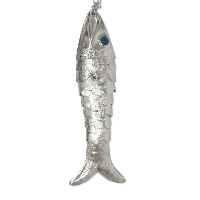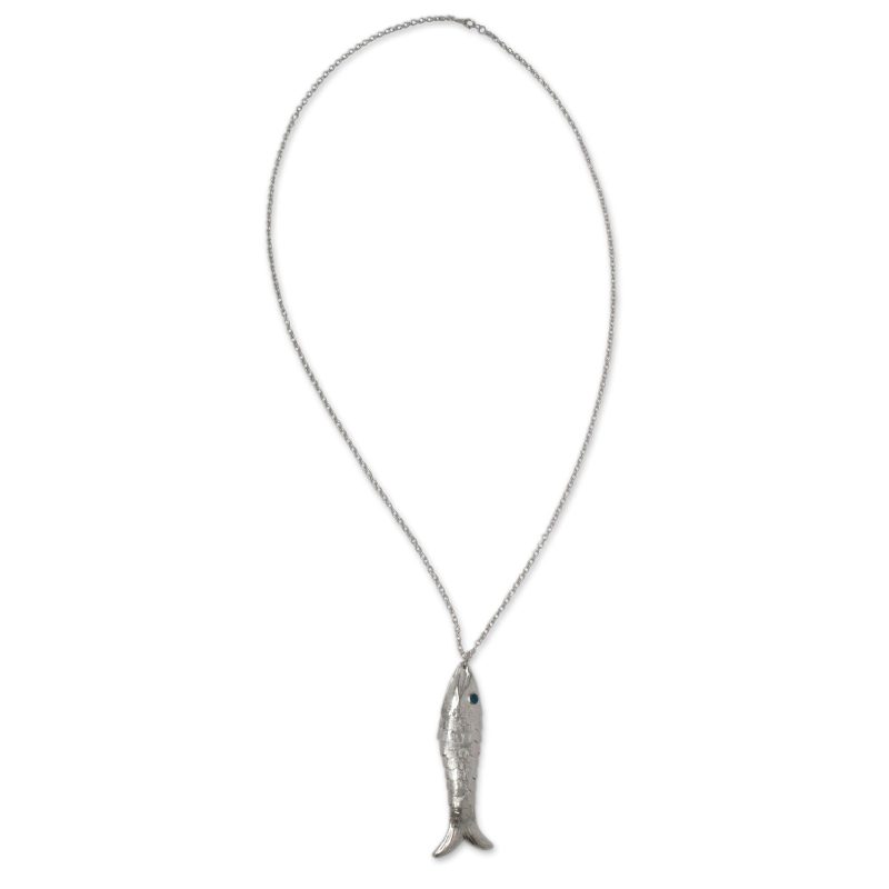 A stunning fish centers a fine long necklace designed by Oscar Figueroa. Crafted of sterling silver, the fish scales are detailed with a brushed satin finish, and its eyes are crafted with blue resin.