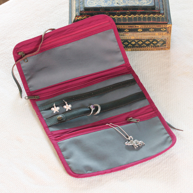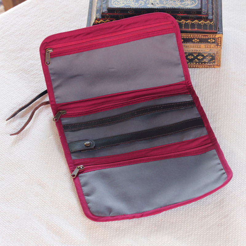 Craftsmanship truly is a family trait for Thailand's Chaloemphon, whose wife creates this handy cotton jewelry roll in deep charcoal grey. The pretty travel case rolls up into a convenient size and ties with a leather strap. Lined in medium grey, inside are three zippered pockets that allow for easy storage of items of different sizes.