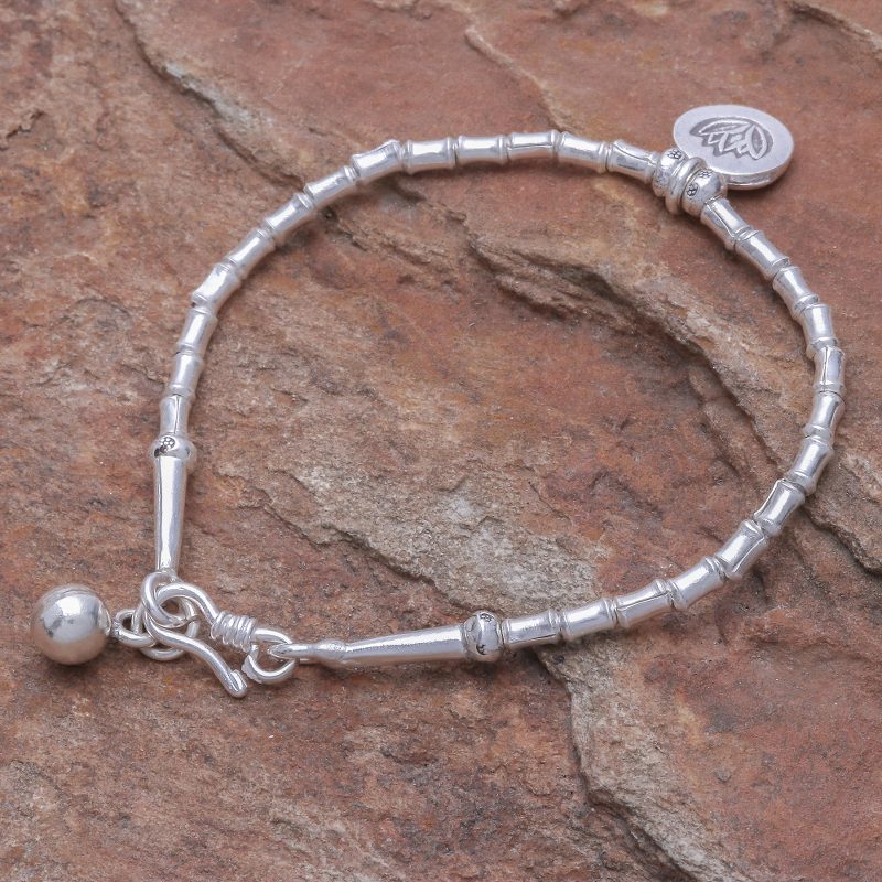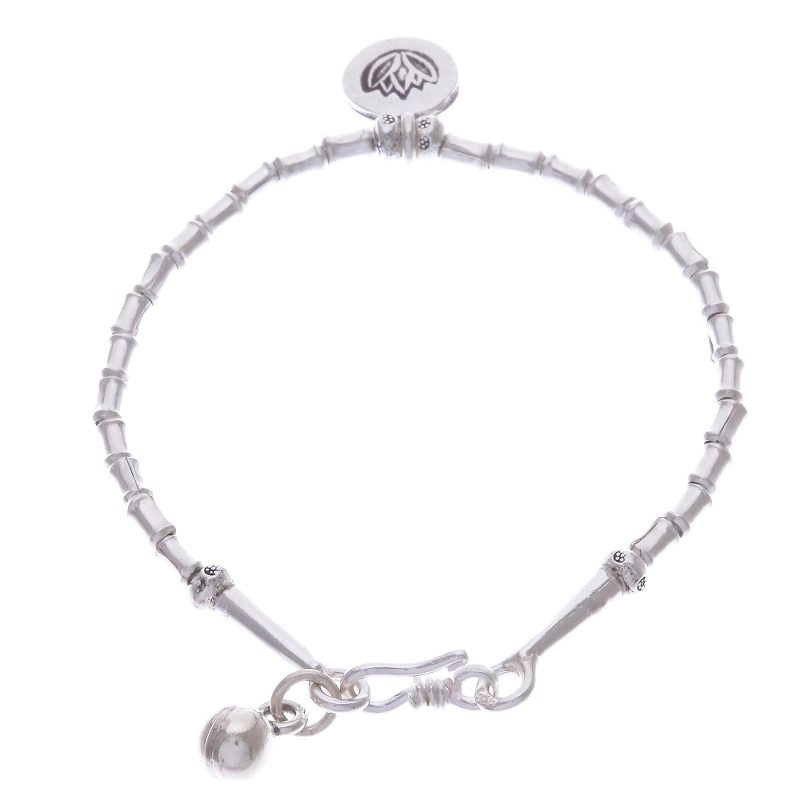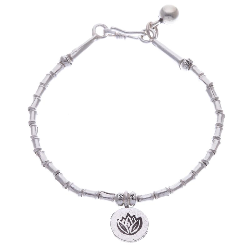 This beautiful charm bracelet is presented by Thailand's Pakaon Sojintarit. Beads of silver from Karen hill tribe artisans circle the wrist, and the accessory is completed by a hand-stamped lotus charm that hangs elegantly from the center of the bracelet.