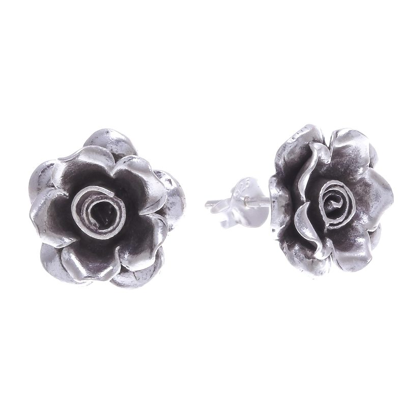 Delicate roses blossom as charming button earrings. From Pakaon Sojintarit, they are handcrafted of 950 silver by Karen hill tribe artisans. The petite flowers pose on sterling silver posts.