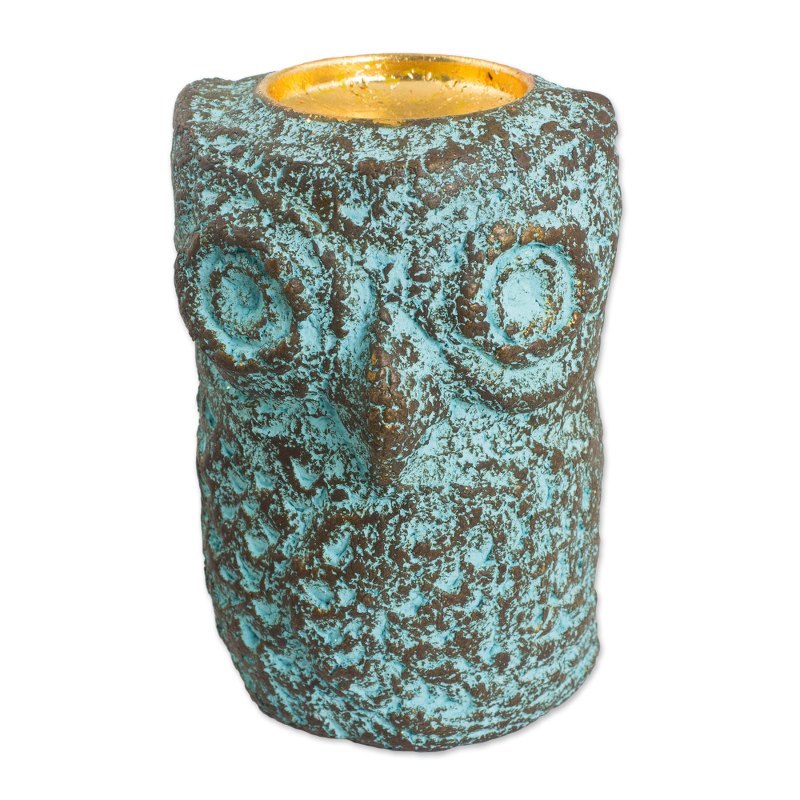 A perky green owl with golden accents does double duty as a candleholder. Always mindful of the ecology, Thailand's Somyot Sawasdee transforms castoffs into original décor objects. He crafts the elephant figurine from recycled paper and adds gilt accents. It is designed to hold a single tealight.