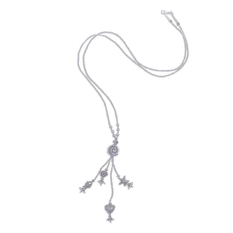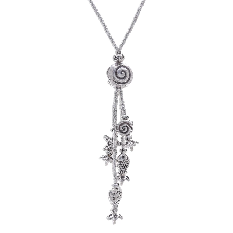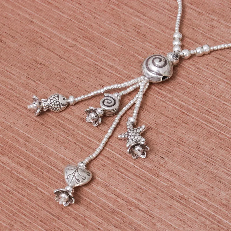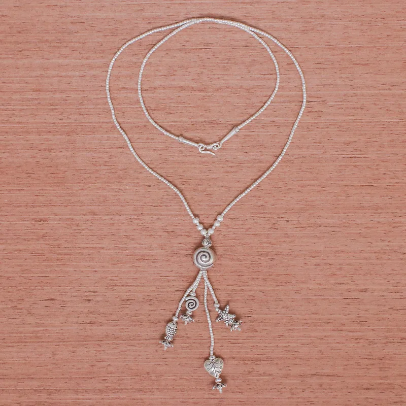 Backed by our 100% Happiness GuaranteeA spiral shell centers this long 950 silver Y-necklace presented by Pakaon Sojintarit. Karen silversmiths hand-craft the beaded necklace, adding a cascade of charms that dangle beneath the pendant. The charms include a fish, a heart, a starfish and a spiral.