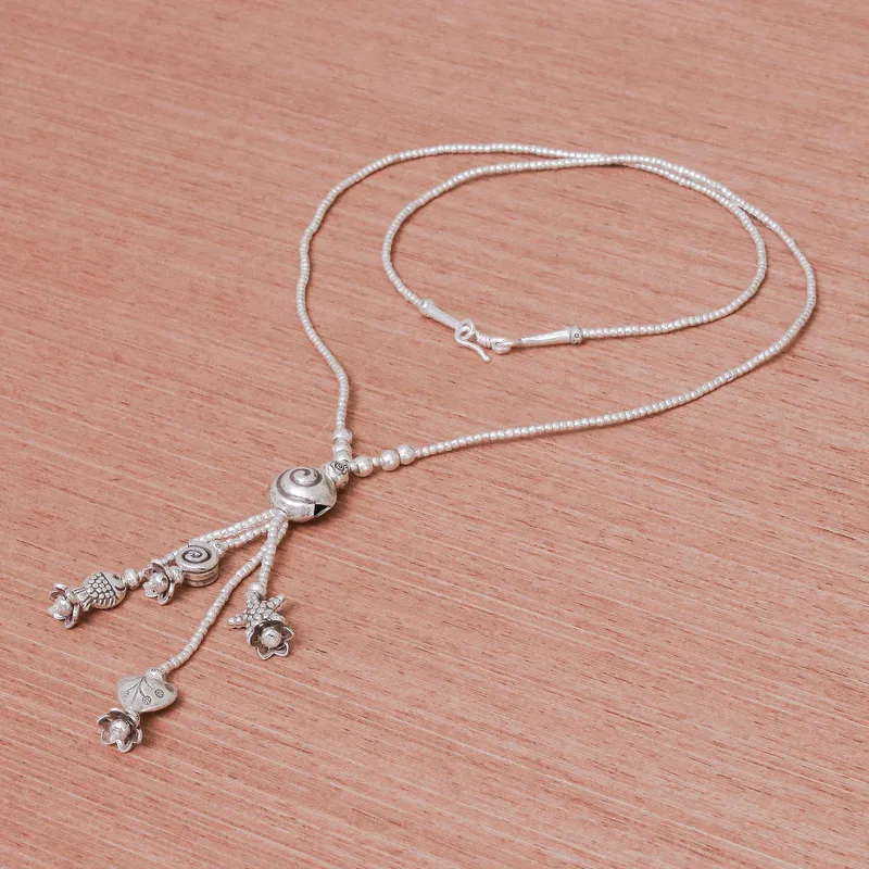 You can find our silver beaded long Y-necklace 'Shell Charm' by Pakaon Sojintarit in jewelry categories such as Hill Tribe Necklaces, Nature Necklaces, Animal Themed Necklaces, No Stone Necklaces and Silver Necklaces. Enjoy exploring these sections for other Novica treasures.