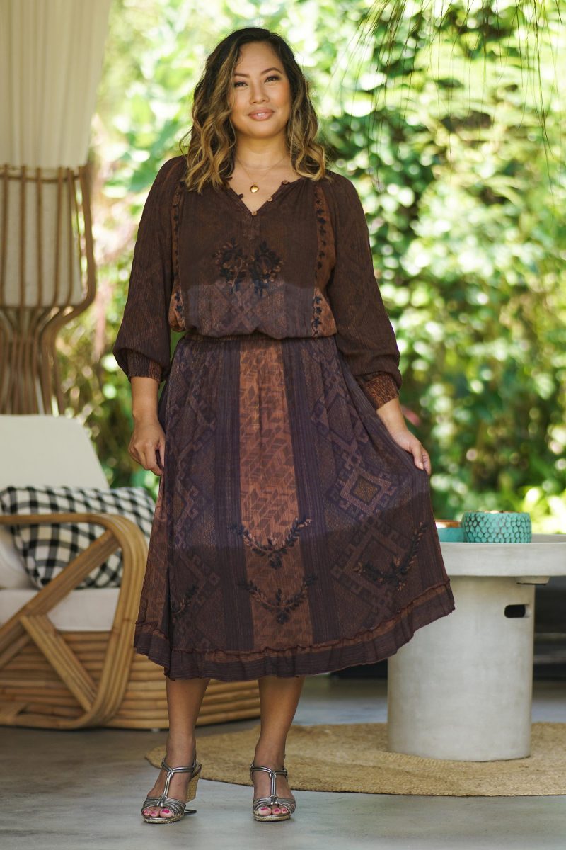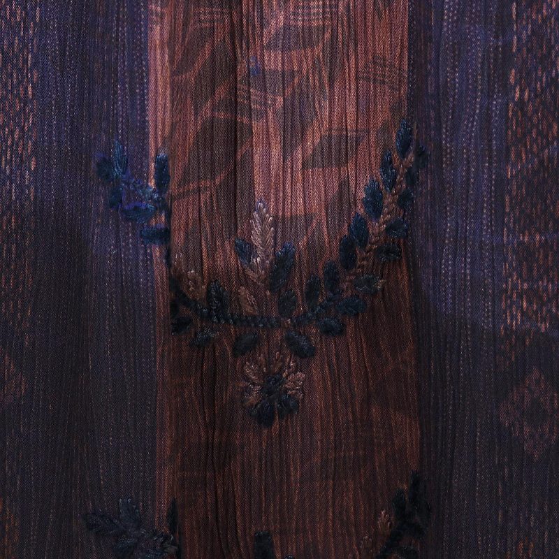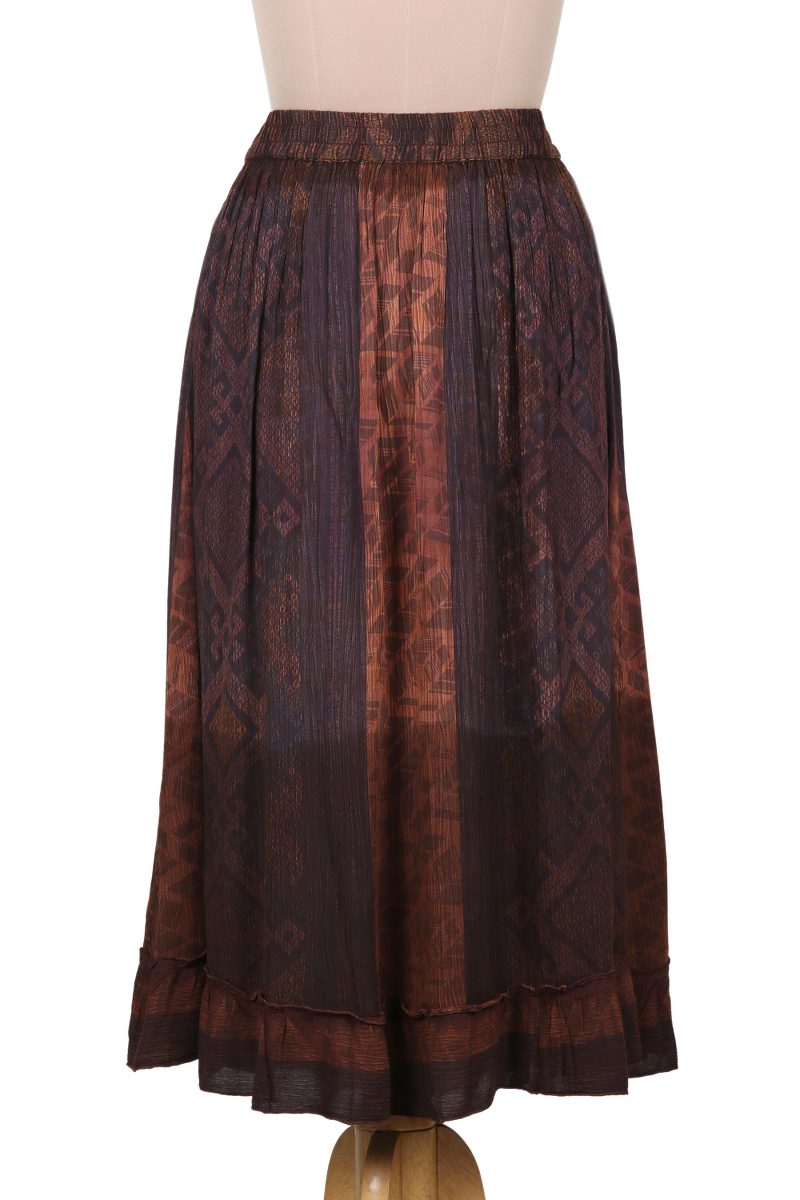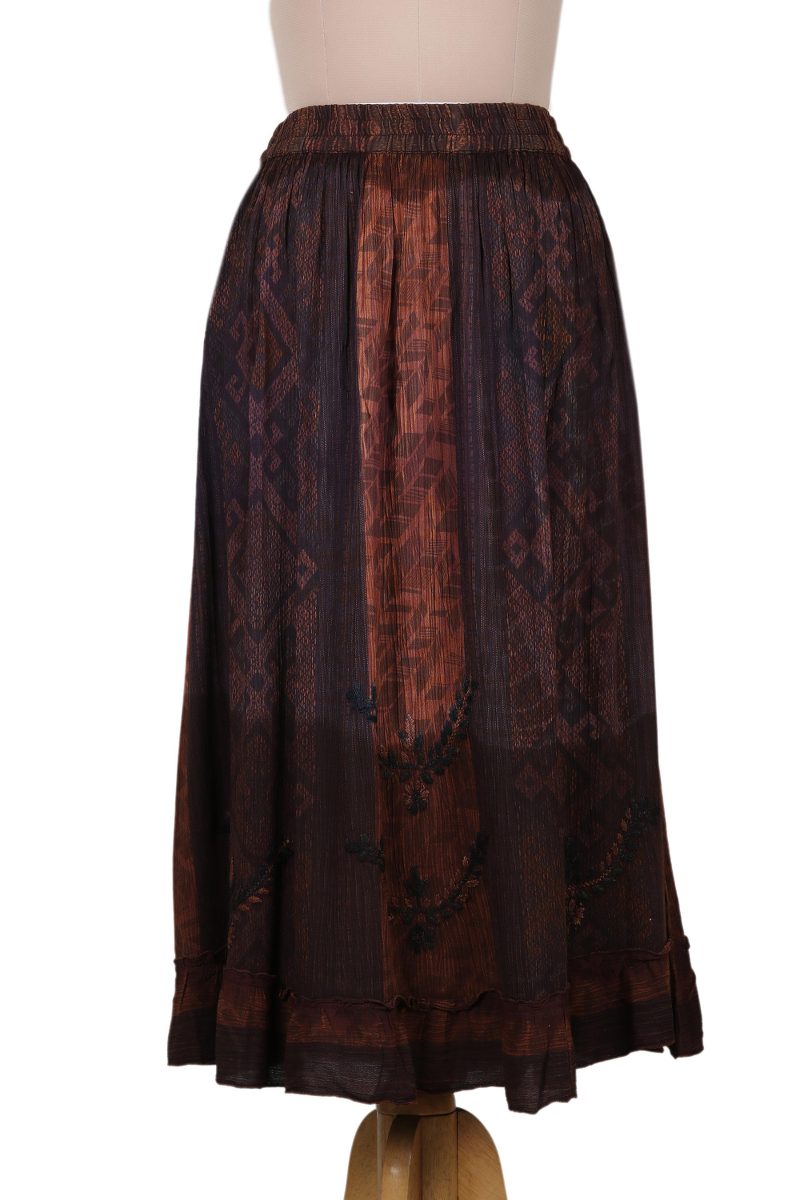 A rich fusion of russet and midnight blue create color harmony on this tie-dyed and screen printed skirt from Rakesh Rana in India. The long rayon skirt is embellished with traditional chikankari embroidery and features a bottom ruffle. An elasticized waist provides maximum comfort.