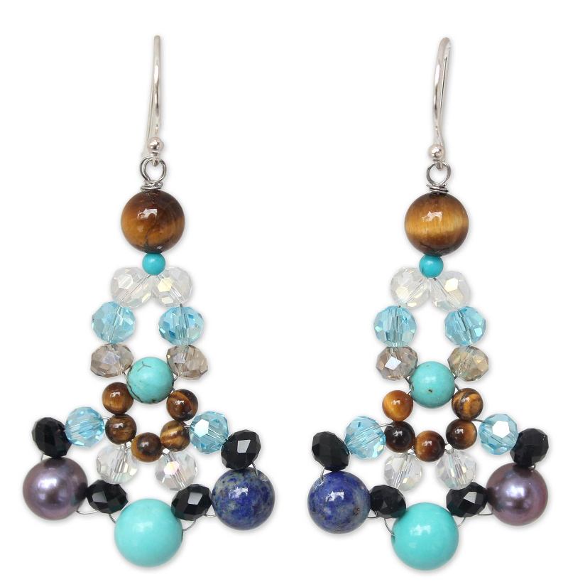 Multicolor carnations cluster on sterling silver hooks. Set with grey pearls, blue calcite and faceted crystalline beads, the blossoms are born of Anusara's love for nature. She transforms them into very feminine earrings, adding accents of lapis lazuli and tiger's eye.