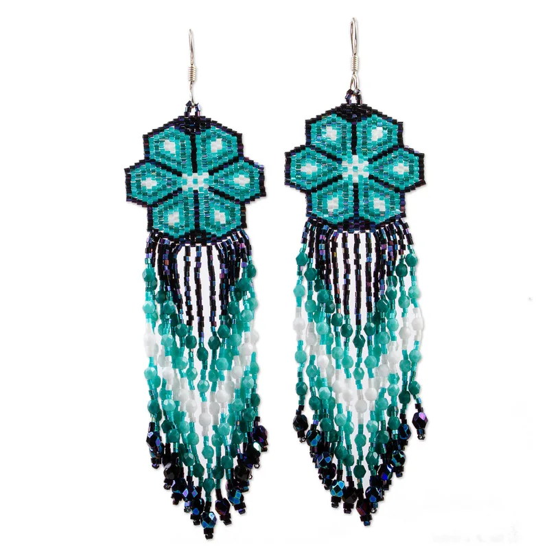 Resembling a flower with six petals, a bright peyote bud, or jikuri graces these dramatic earrings. Believed to enlighten the one who partakes of it, jikuri is an essential element of Huichol religion. Huichol Center for Cultural Survival and Traditional Arts artisans craft the five-inch-long pair, meticulously placing tiny seed beads one by one. A long beaded fringe cascades from beneath.