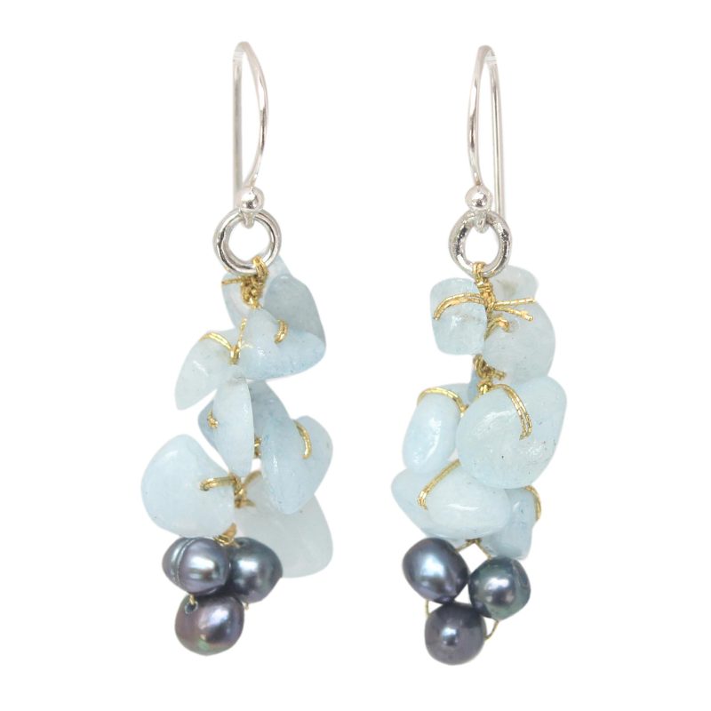 To create these enchanting earrings, Thai designer Nareerat knots gemstones by hand on silken cords. The gossamer web holds black cultured pearls and cool aquamarine.