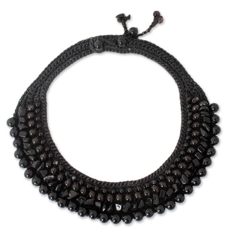 Stylish in black, this crocheted necklace is by Thailand's Chuleekorn. For this choker necklace she combines the glistening beauty of onyx, black agate and smoky quartz. The necklace can be adjusted to the desired length.