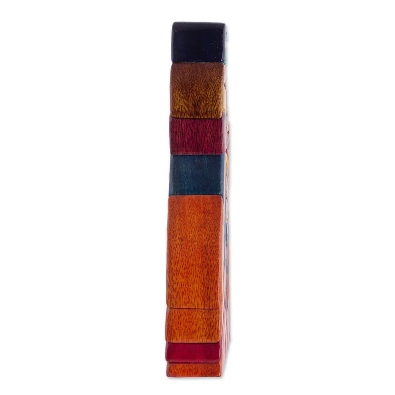 United in one piece of Ishpingo wood, Joseph, Mary and Joseph are a beloved Holy Family. John Barrow creates the admirable sculpture with the illusion of a jigsaw puzzle that is rich with expressive artistry.