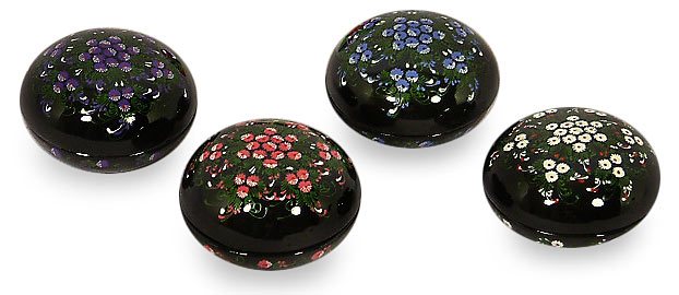 Heralding summer, phlox blooms in delicate bouquets on sleek black lacquer. Finely hand-painted in white, violet, blue and pink, they grace four handcrafted boxes. Nantana Sompamitre presents an extraordinary example of Thai lacquer art.