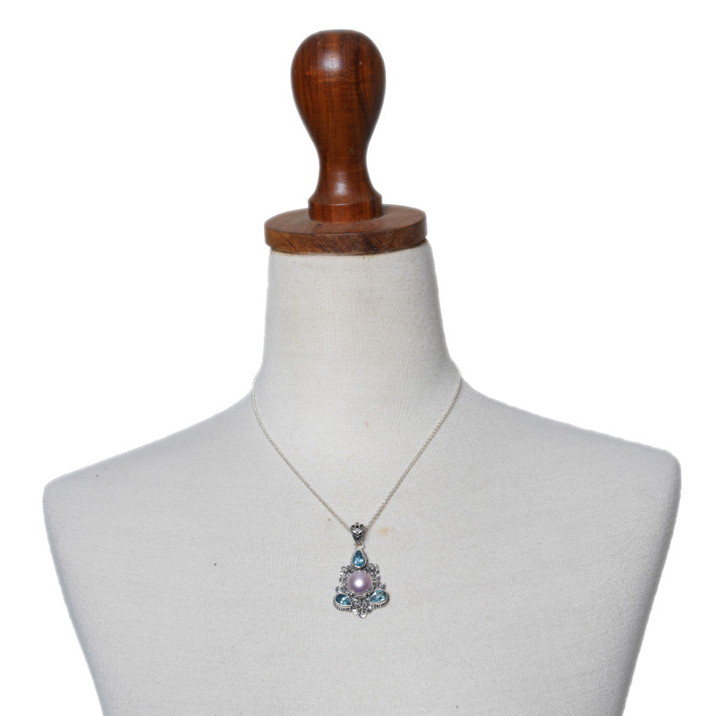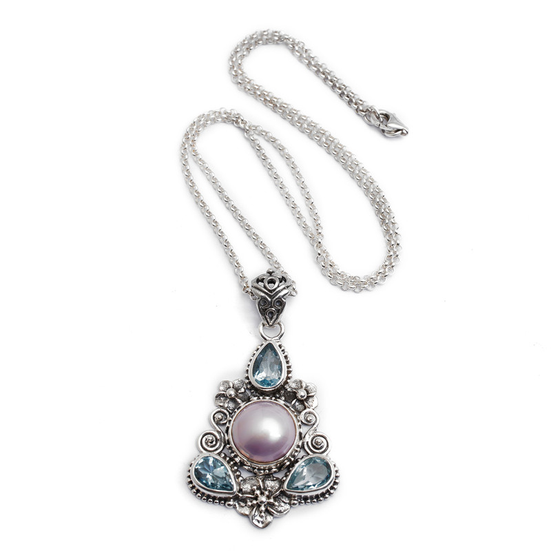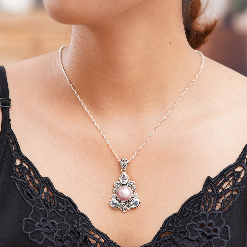 You can find our cultured pearl and blue topaz floral necklace 'Pink Frangipani Trio' by Buana in jewelry categories such as Floral Necklaces, PEARL Mabe Necklaces, Sterling Silver Necklaces and Pendant Necklaces. Enjoy exploring these sections for other Novica treasures.