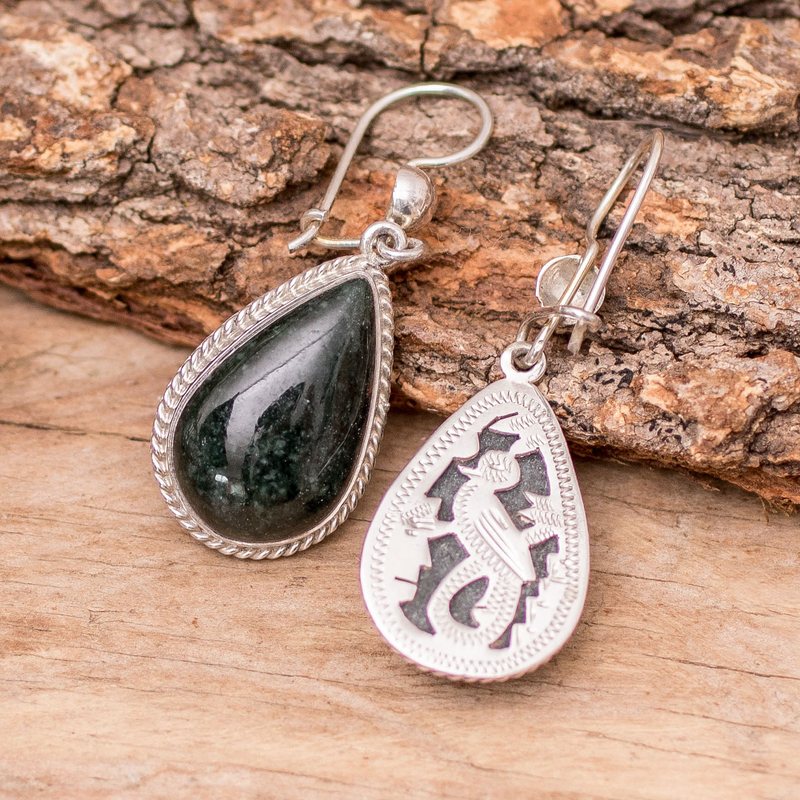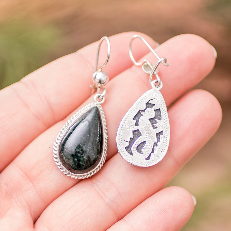Delivery EstimateResplendent in sterling silver, the quetzal bird was believed to be the god of air by the ancient Maya. Today it is Guatemala's national symbol. Classed as a near-threatened species, a quetzal hides behind droplets of dark green jade. Zandra Lorena Sajbin handcrafts her original earrings in honor of ancient traditions.