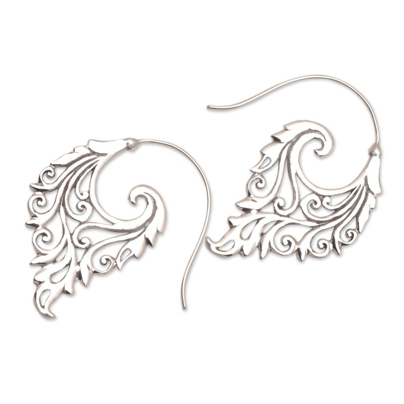 Culminating in points, exciting vine patterns are crafted from sterling silver that curls below the ears. Nyoman Rena creates these half-hoop earrings from Bali, realized with intricate openwork.