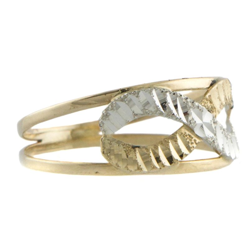 In yellow and white 10k gold, an infinity symbol draws endless admiration on a ring from the Biason Family of Brazil. The pattern features diamond-cut accents that captivate with a luminous effect.