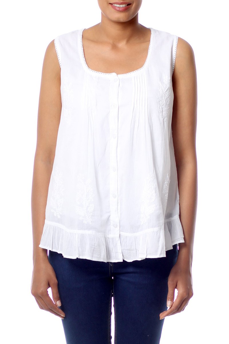 Beautifully feminine, this blouse showcases India's chikankari hand embroidery. Shalabh works in white on white to create floral motifs. The sleeveless cotton top features a ruffle around the hem.