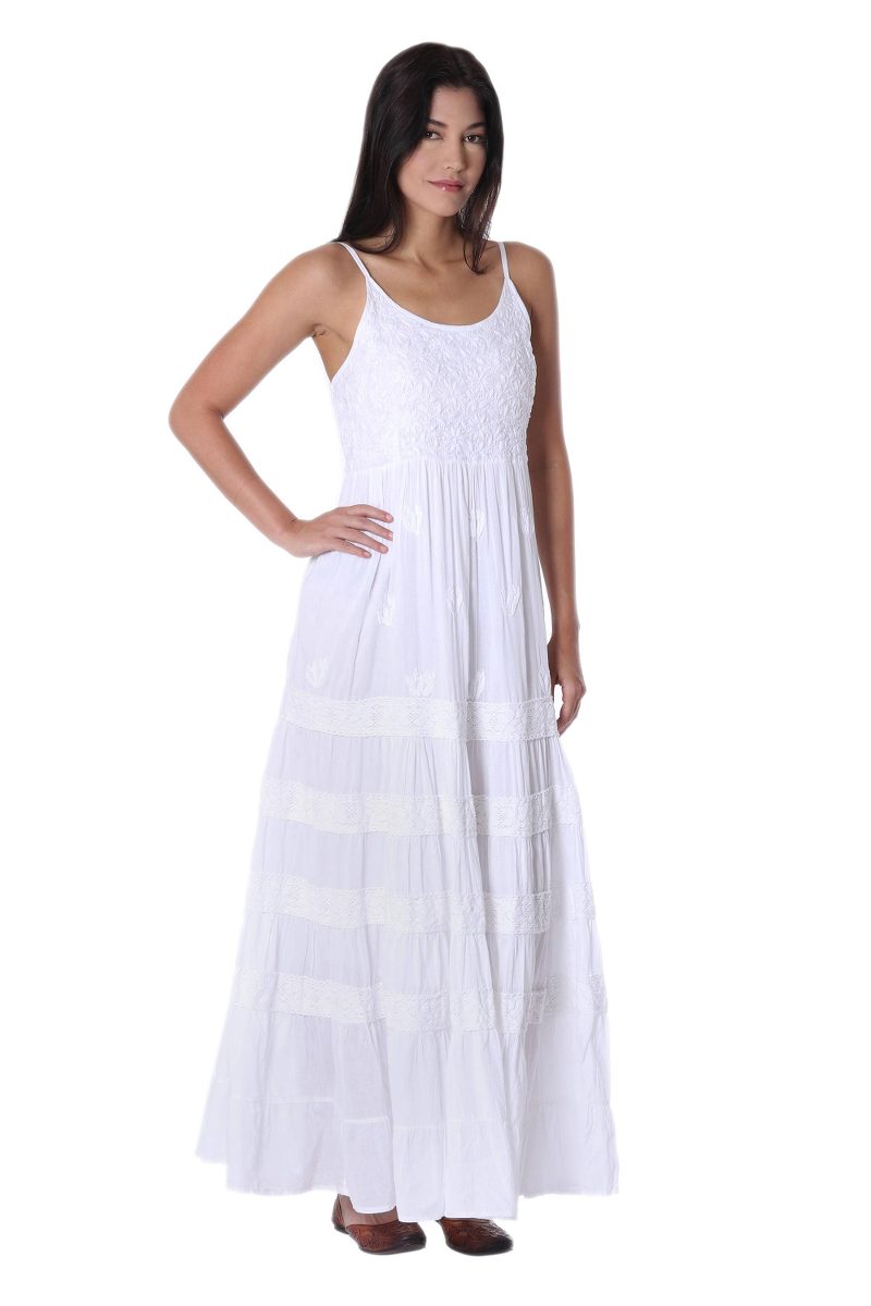 From sunrise to sunset, this white cotton maxi dress is a go-anywhere fashion must-have. Indian designer Shalabh highlights traditional chikankari hand embroidery on the fully lined bodice and paneled skirt. Features adjustable spaghetti straps and elastic across the upper back. Size M is 56" long from top of strap.