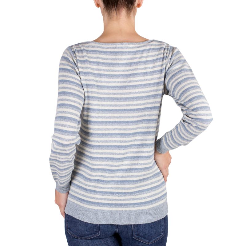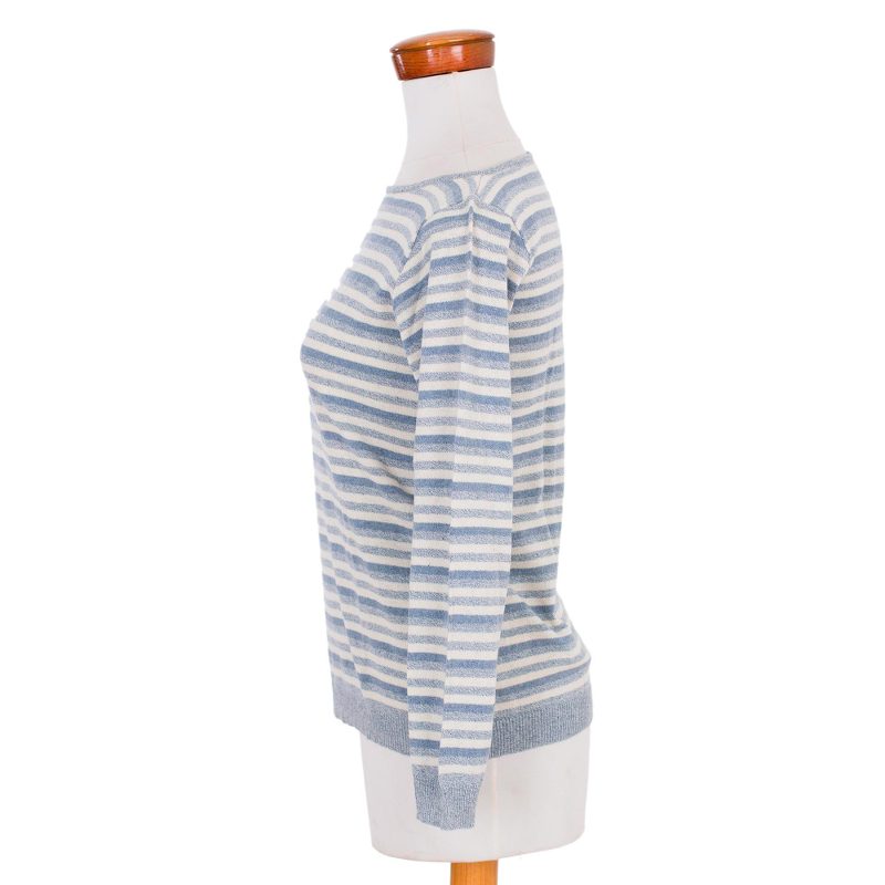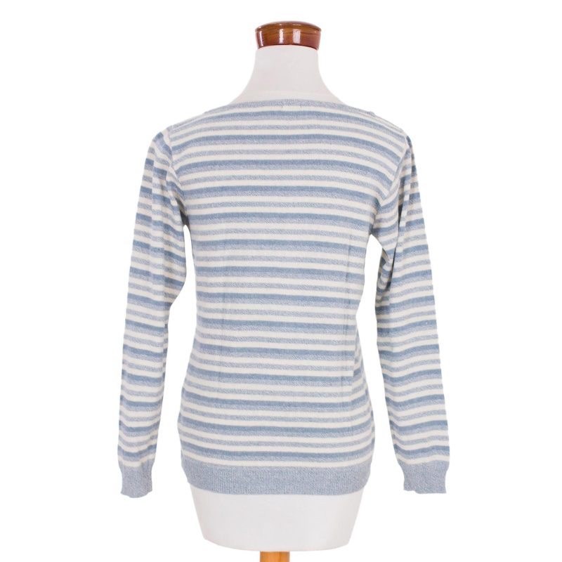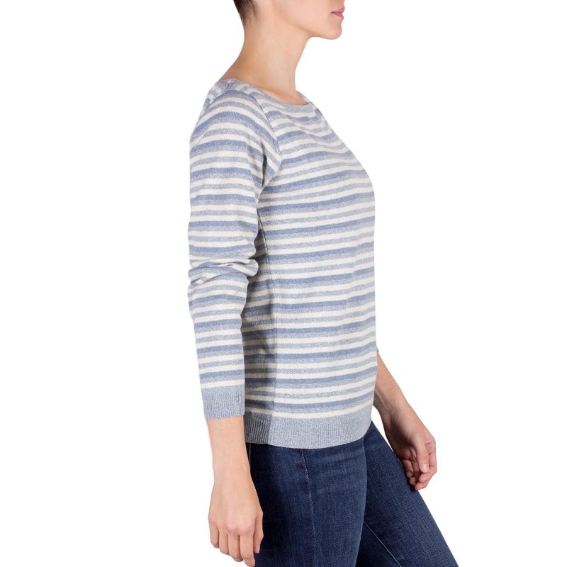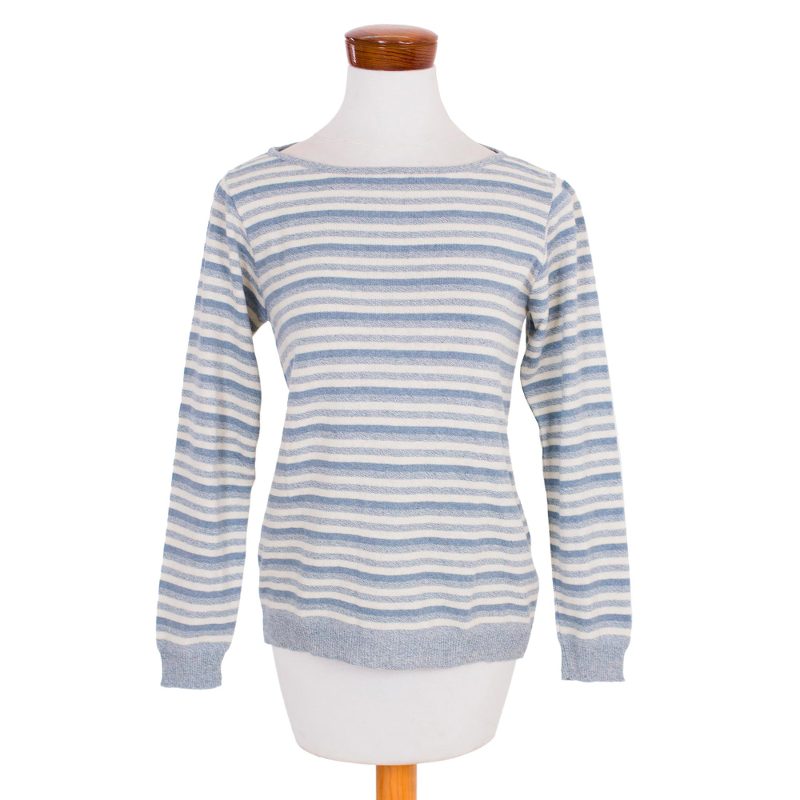 Guatemala's Luisa Villavicencio designs an elegant long-sleeved sweater that is knit with the cotton harvested at her family's farm. Featuring natural ivory and Wedgwood blue horizontal stripes, the sweater is also knit with recycled denim fibers. Villavicencio says, "I designed this sweater considering the desires of today's women to dress in casual elegance."