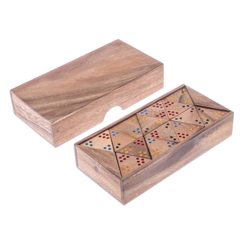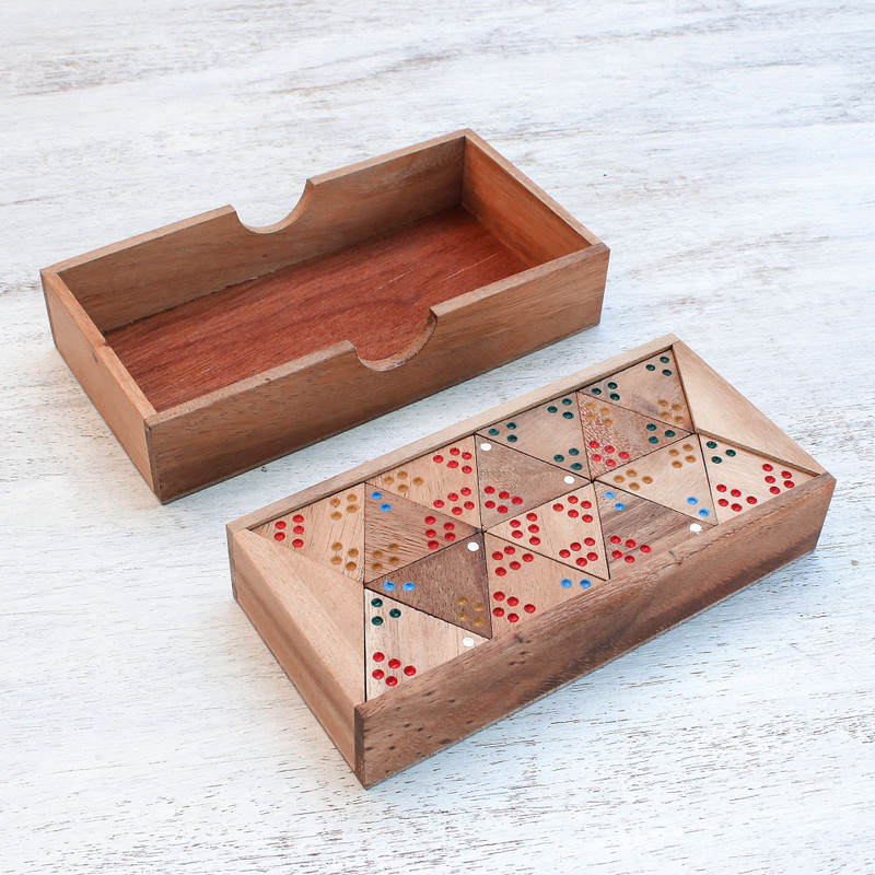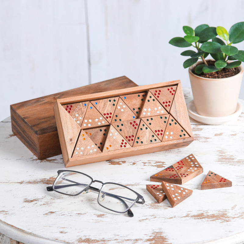 By Thai artisan Waraporn Khamsuk, this domino set offers a unique twist on the traditional tabletop game. Handmade from raintree wood, 56 triangular dominoes or "Trionimoes" come within a handy wooden box. The corner of each domino is hand-painted with colorful dots. This 2-6 player set offers fun for the whole family.