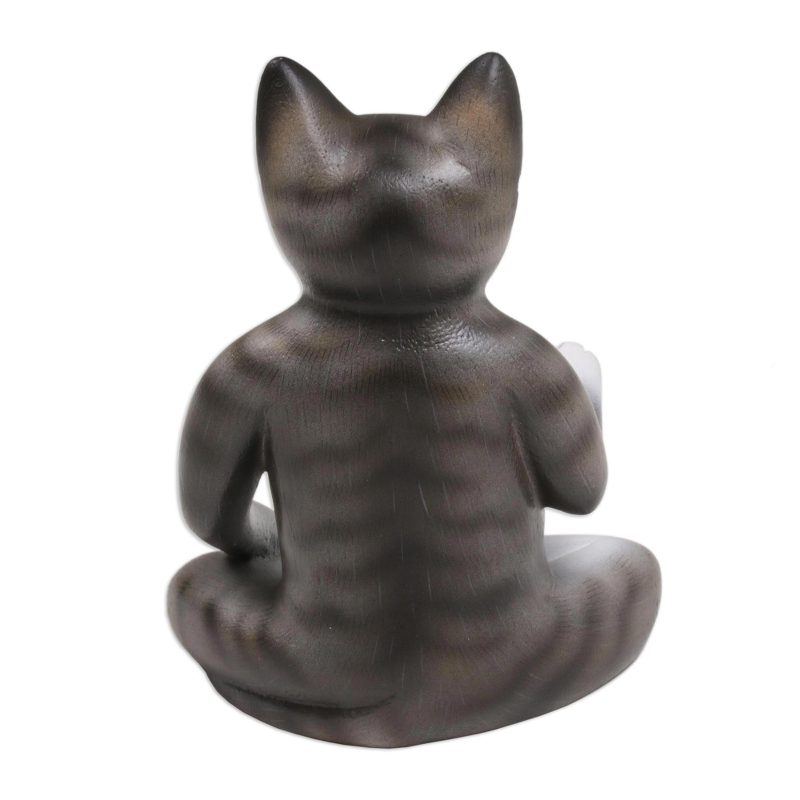 Achieving nirvana, this cat brings a meditative vibe to your home. Bali's Nengah Sudarsana designs the sculpture, hand-carved of suar wood to depict the cat with legs crossed and a single hand outstretched in a blessing. The cat is then painted in colors of white and grey.