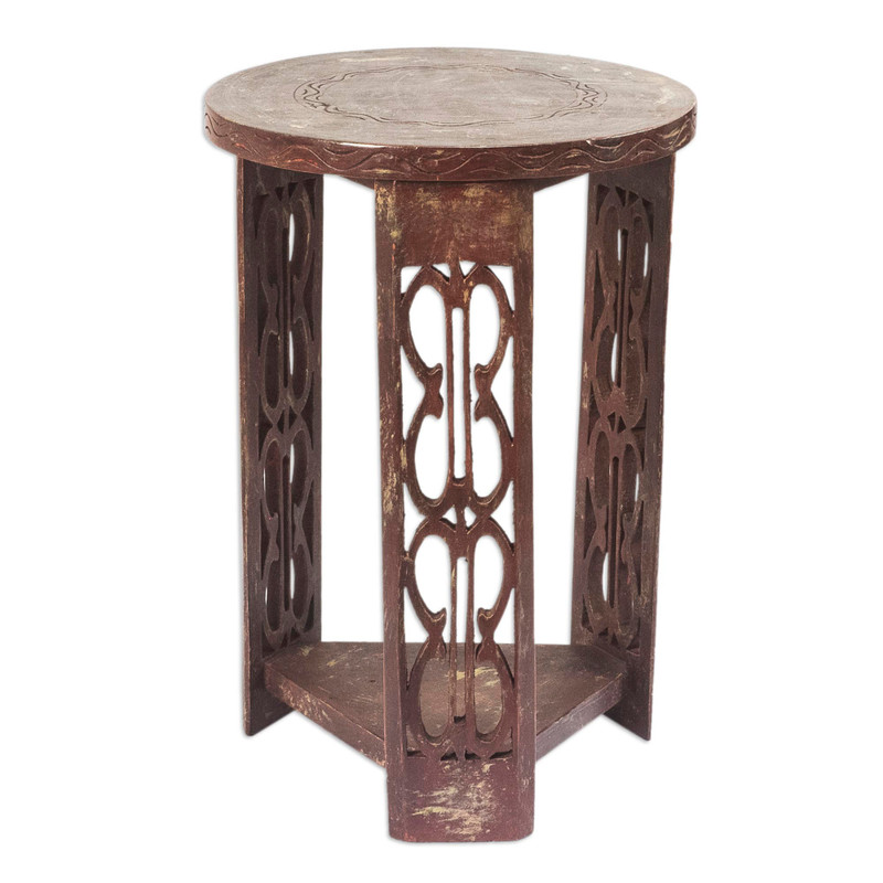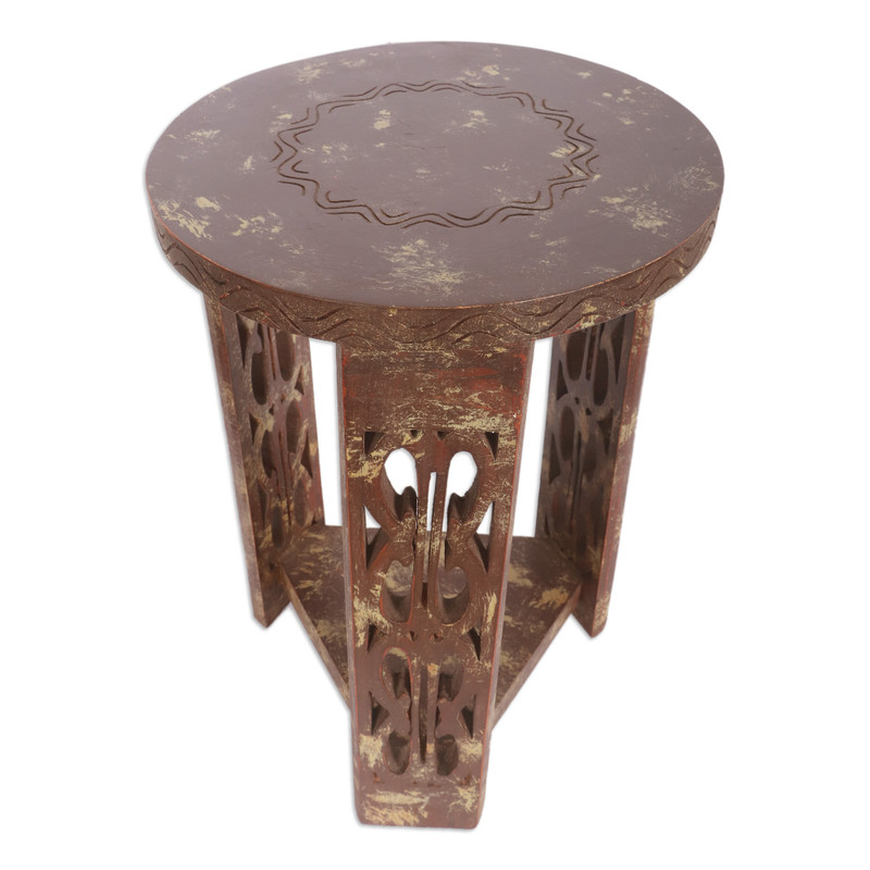 By George Obeng, this handsome end table conveys the beauty of West African tradition. The circular table is crafted of native sese wood with wave motifs carved into the borders. The base depicts an adinkra symbol known as Hye Wonhye in the Twi language. "This symbol signifies the tendency to withstand pain and other hardships. It is a symbol of imperishably and endurance," the artisan explains.