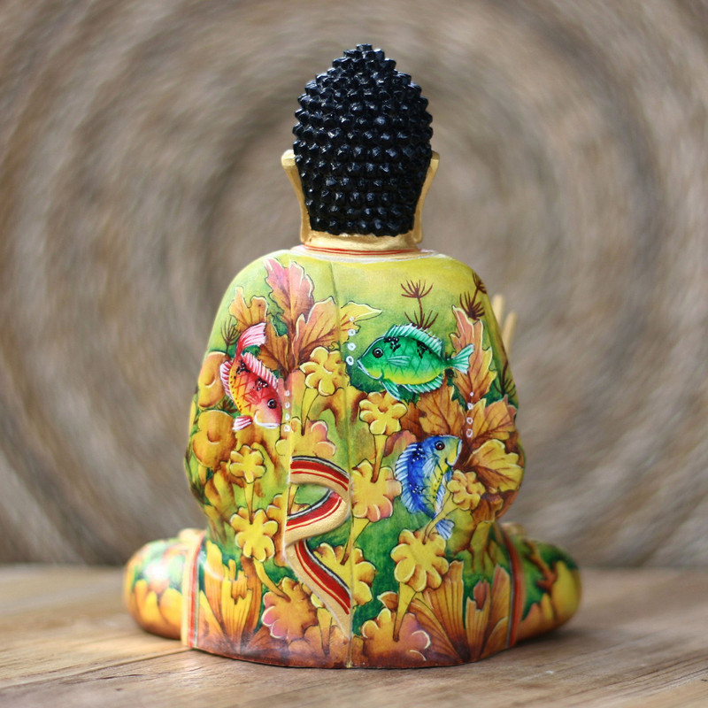 Carved by hand of crocodile wood, this lovely image depicts Buddha sitting in meditation. His right hand is raised with the thumb and index finger touching, explaining his teachings, while the position of the left hand symbolizes meditation. Gung Gus paints the sculpture in clear colors, creating underwater scenes on the Master's flowing robes.