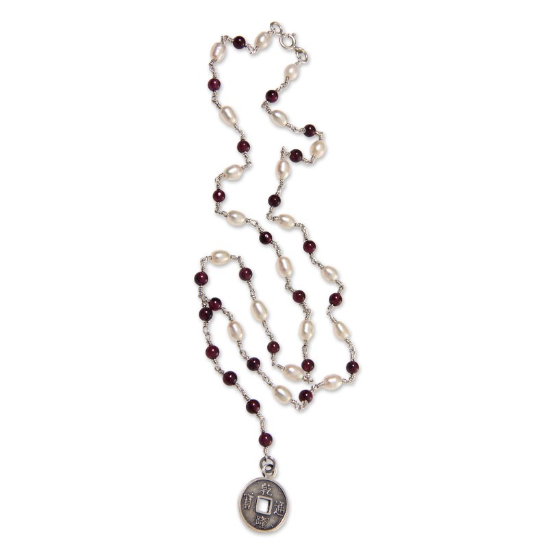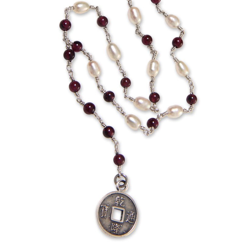 Balinese master silversmith Buana presents an intriguing necklace featuring ivory and crimson gems. The sterling silver Y necklace is punctuated with beads of garnet and creamy white cultured freshwater pearls. Serving as the pendant is a replica pis bolong, an ancient coin brought to Bali from China that is now used in many Hindu ceremonies, as it is believed to bring good luck.